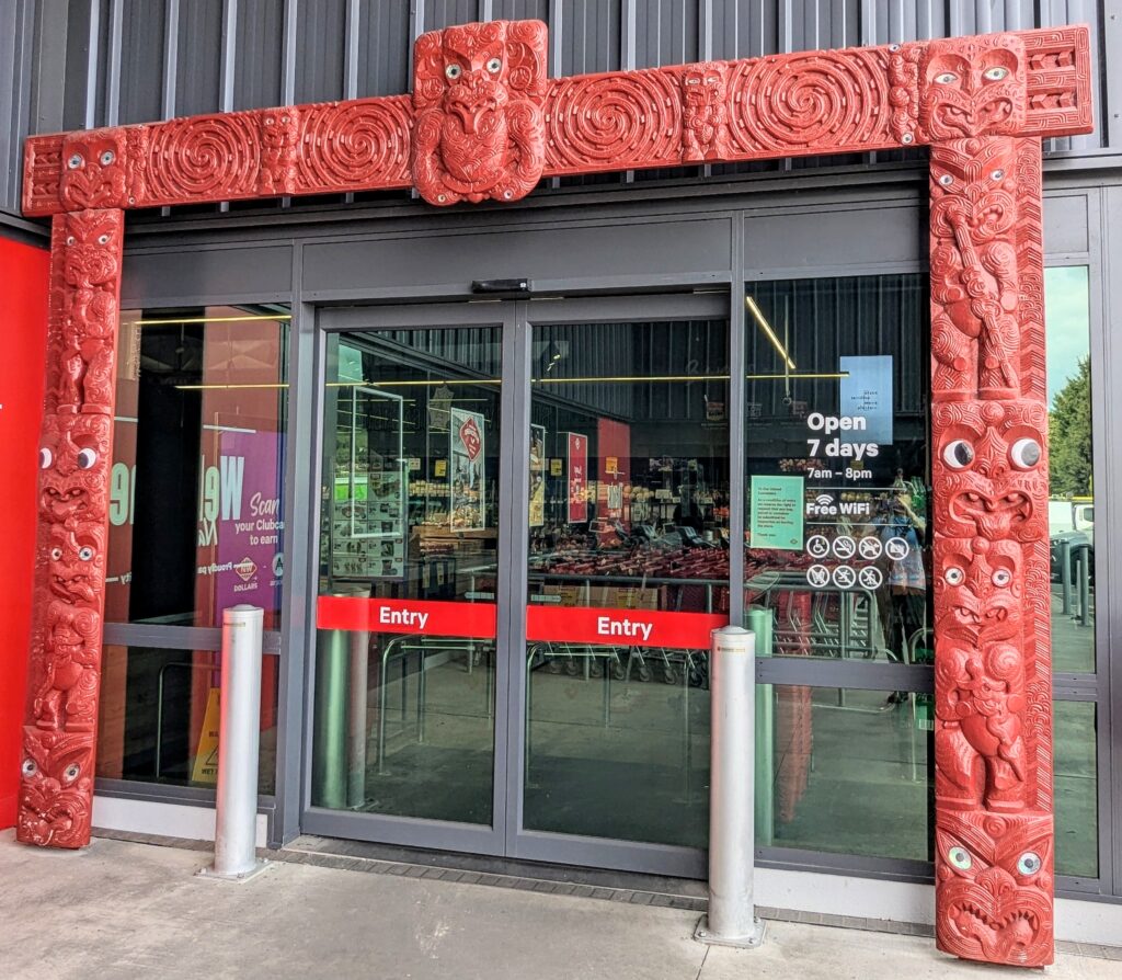 “The new store [opened in 2023] has a specially commissioned … tōtara [a species of native tree] carving called ‘Nau Mai Ki Te Ao Hou’ which depicts the Māori food gods. Translating to mean ‘Welcome to New World’, it was made by local carvers from Ngāti Hāua [local iwi or tribe]…and the tōtara was sourced locally before being shaped using traditional methods over the space of three months. Situated in the kūwaha or store entrance, Nau Mai Ki Te Ao Hou will welcome future generations of shoppers to New World Taumarunui. “