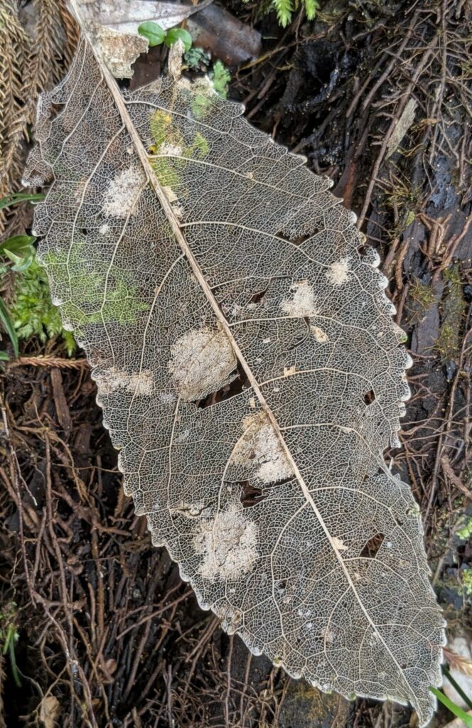 The beautiful lacy skeleton of a leaf greeted us as we entered the cool shade of the forest.