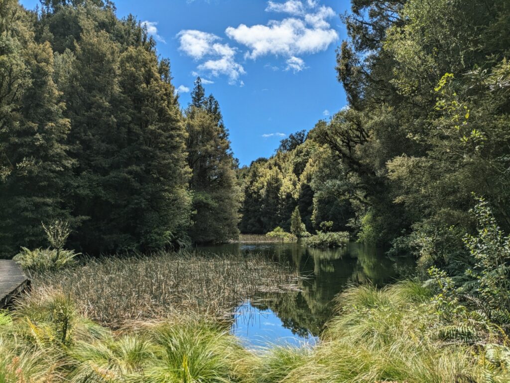 Today’s adventure was a walk in the woods, and these woods felt different from all our other walks in the woods! We visited the Ohinetonga Scenic Reserve at the edge of the small town of Owhango and the Tongariro Forest Conservation Area. The native forest had been heavily logged from the early 1900’s when the railroad arrived in the area until the 1960’s when the accessible timber was gone. In the 1980’s local residents and the Tongariro Forest Park Promotion Committee fought government plans to clear cut most of the remaining forest. However, the Ohinetonga Scenic Reserve was spared the ravages of historic milling because it had been preserved by the town as a scenic reserve early in the 1900’s! Since the 2010’s further work to eradicate plant and pest invasives has revived the native fauna as well, with native bird species including the whio (blue duck), keruru (big colorful pigeon) and kiwi finding refuge here.