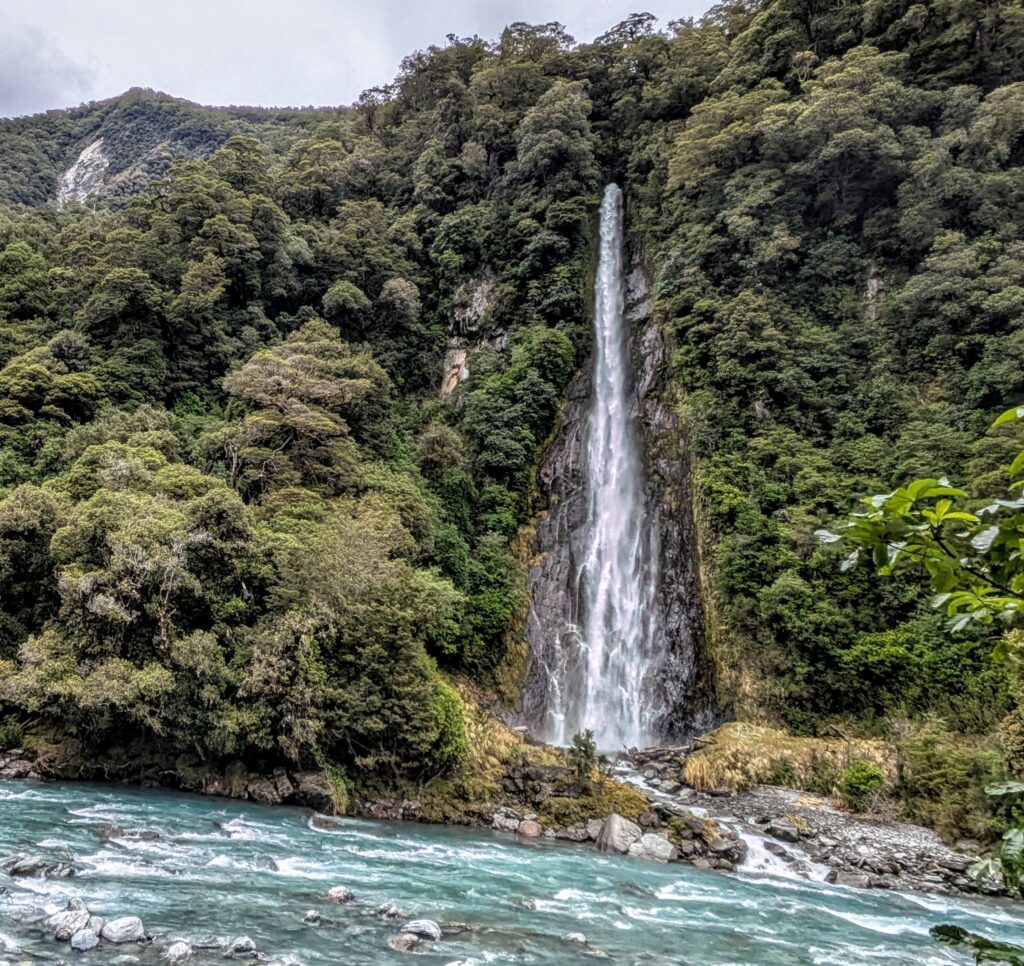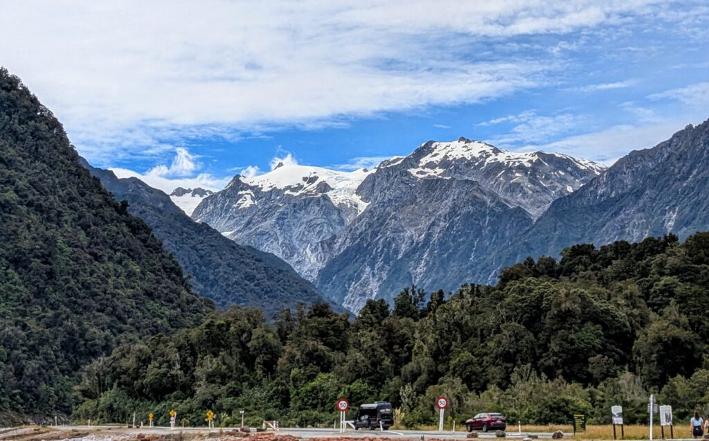 We are staying at a B&B in Ōkārito on the shore of the Tasman Sea. On a clear day several peaks of the Southern Alps can be seen out the back from the bedroom window, over the long thick leaves and flower spikes of the flax plants. Today we decided to drive up to the Glacier car park in Westland Tai Poutini National Park to see what’s up there.