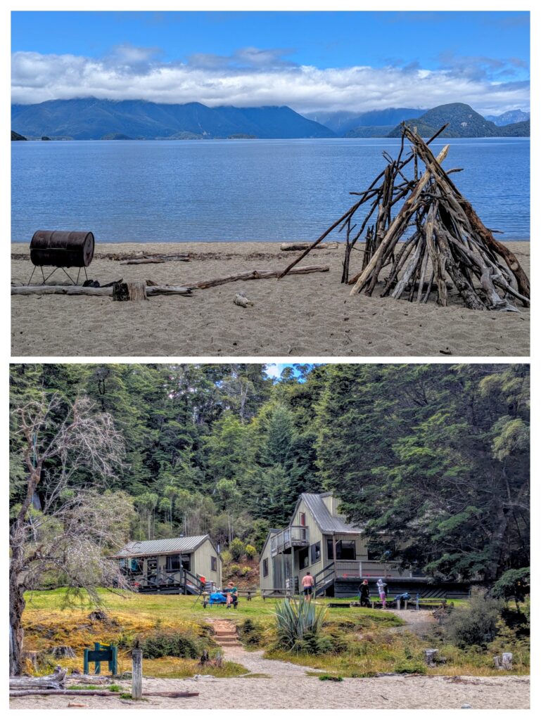 We reached our goal of the Moturau Hut on the shore of Lake Manapouri, where we ate lunch and watched the ‘trampers’, the hikers who were mostly on the last day of their Kepler Track adventure. The smaller ‘hut’ on the left is for the guides (or rangers?). The NZ Walks are so popular that your space in the huts along the routes need to be booked well in advance and ‘free’ camping in the forest is not allowed! Cooking facilities, ‘long drop’ toilets and bunks with mattresses are provided, along with a wood stove to heat the hut and lots of firewood! This hut has a fantastic view across the lake, and even a barrel BBQ grill in the beach!
