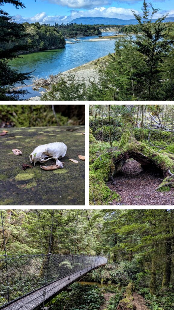 Back into the emerald green forest, with occasional views high above the river towards distant mountains, interesting natural features and another swingbridge! We also found the skull of a stoat, known as the short-tailed weasel or ermine in North America, on top of the trap that probably killed it! The stoat was purposely introduced to NZ to control the rodents that had accidentally been introduced. Unfortunately the weasel found it much easier to prey on the flightless and flying birds of NZ that had no land mammal predators at all and were helpless in the face of this aggressive new threat. There are big wooden traps on almost every trail to trap stoats, ferrets and special traps for the larger possums, introduced for the fur trade in the 1850’s through the early 1900’s. A country wide effort is underway to make make NZ predator free by 2050, an ambitious goal that is highlighted in THIS ARTICLE.