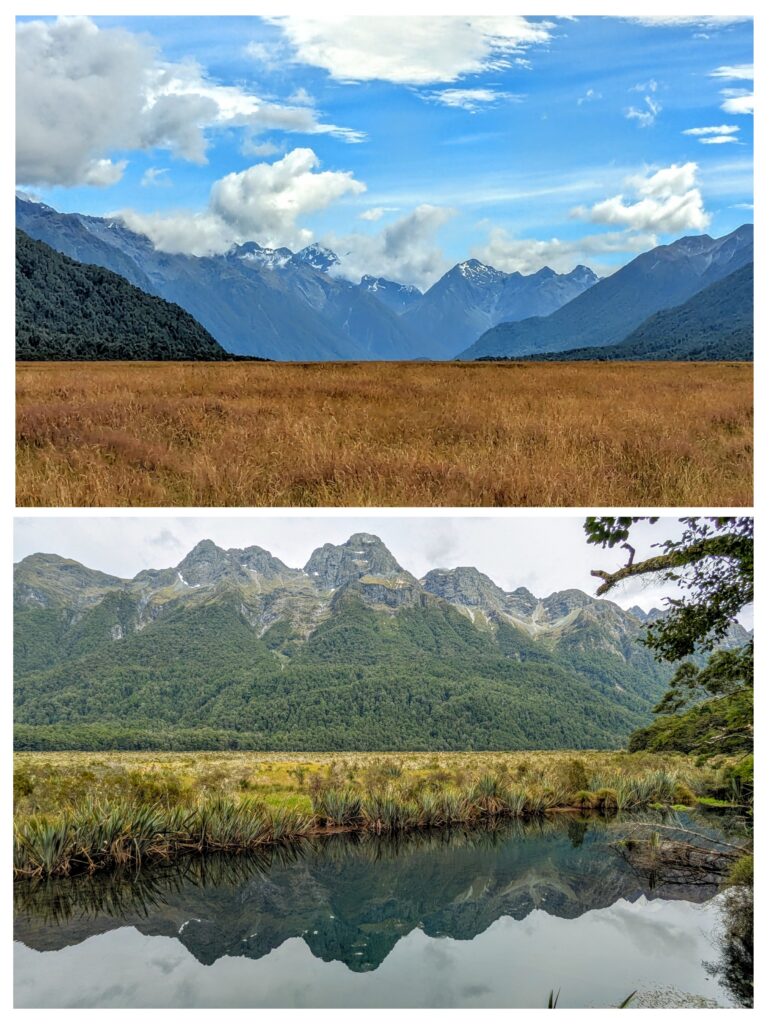 Stopping for pictures at Eglinton Valley and Mirror Lakes, and to marvel at the huge mountains with a smattering of snow dusting the peaks.