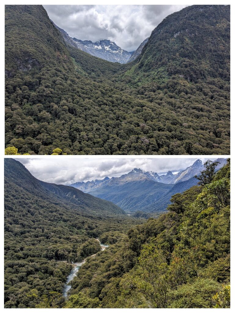 From this vantage point we looked across the valley and up towards the hanging valley that holds Lake Marian. There is a trail somewhere under that vegetation up to the lake! We also looked down into the Hollyford Valley where Marian Falls flows into the Hollyford river/Whakatipu Kā Tuka river, where another famous NZ Walk, the Hollyford Track travels. We returned to our little cabin on Lake Manapouri and enjoyed our last night on the edge of Fiordland National Park.