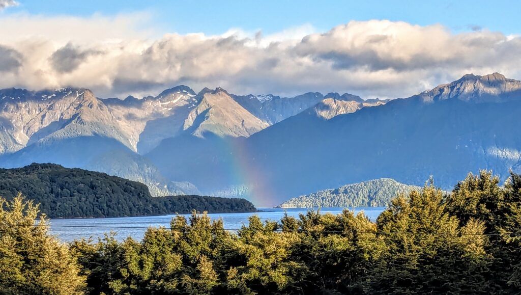 We had a beautiful view of the Fiordland mountains as we drove out of town. The only time in our weeklong stay here that the clouds rose enough to present them in the morning glow of sunshine, with a rainbow thrown in for effect!