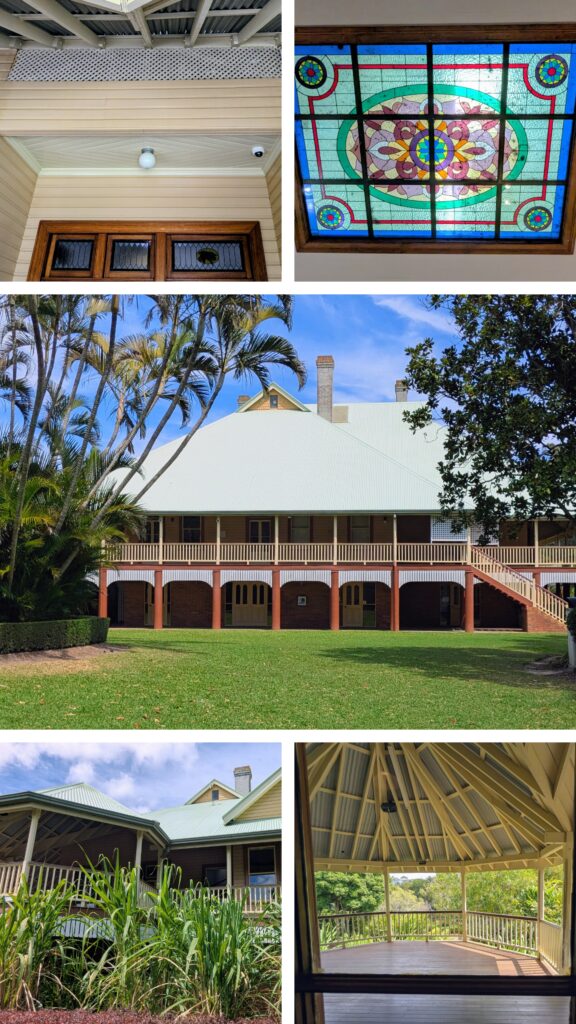 The house is a fine example of the ‘Queenslander” architecture. Large verandas, tall roof that is actually a huge air duct, creating draft that cools the interior, and raised off the ground, maybe to protect from the snakes? The stained glass skylight lets light into the interior, and the huge overhangs shade the house. It is only 3 bedrooms, 1 bath, parlor, formal dining room and casual dining room. The kitchen and servants room are separate, to the right of the entrance, for fire safety
