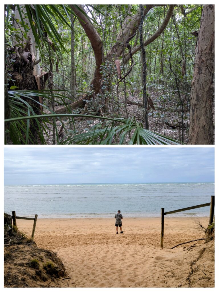 We found a tiny 18 acre reserve along the bay, preserving a small remnant of the ‘vine forest’ that once blanketed the south Queensland coast. We walked through the dry rainforest, listening to the birds in the bush. The forest opened onto a pristine empty beach with osprey perched in the trees watching for fish in the shallow bay waters.