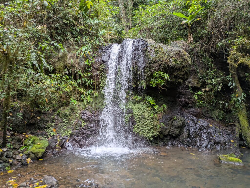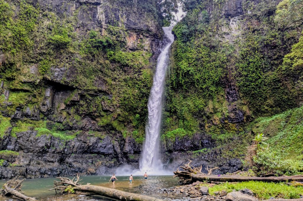 As we reached the main waterfall we realized how big it is! For reference you can see the 3 people wading into the pool to swim! We opted not to swim, we didn’t bring any towels, and we heard there are leeches in the water!