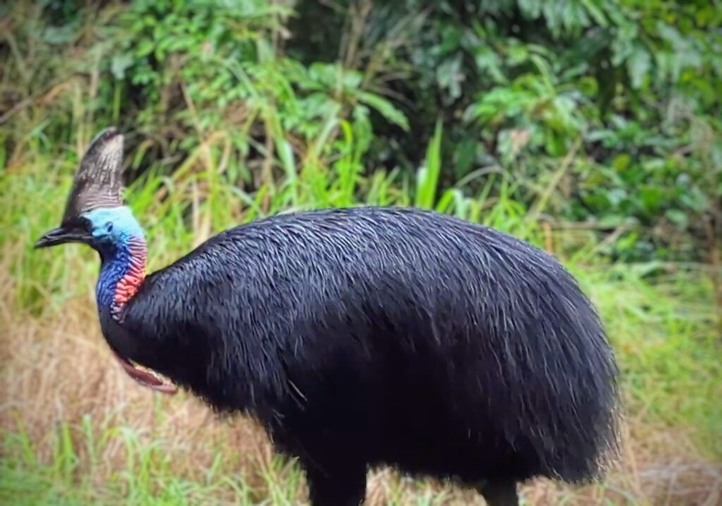 A wild cassowary casually walking along the road, his throat wattle swinging with the rhythm of his long-legged stride!