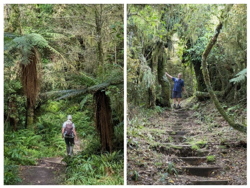 The track went up and down over ridges as we rounded the mountain, through a rain forest atmosphere, full of ferns and mosses overhead and underfoot!