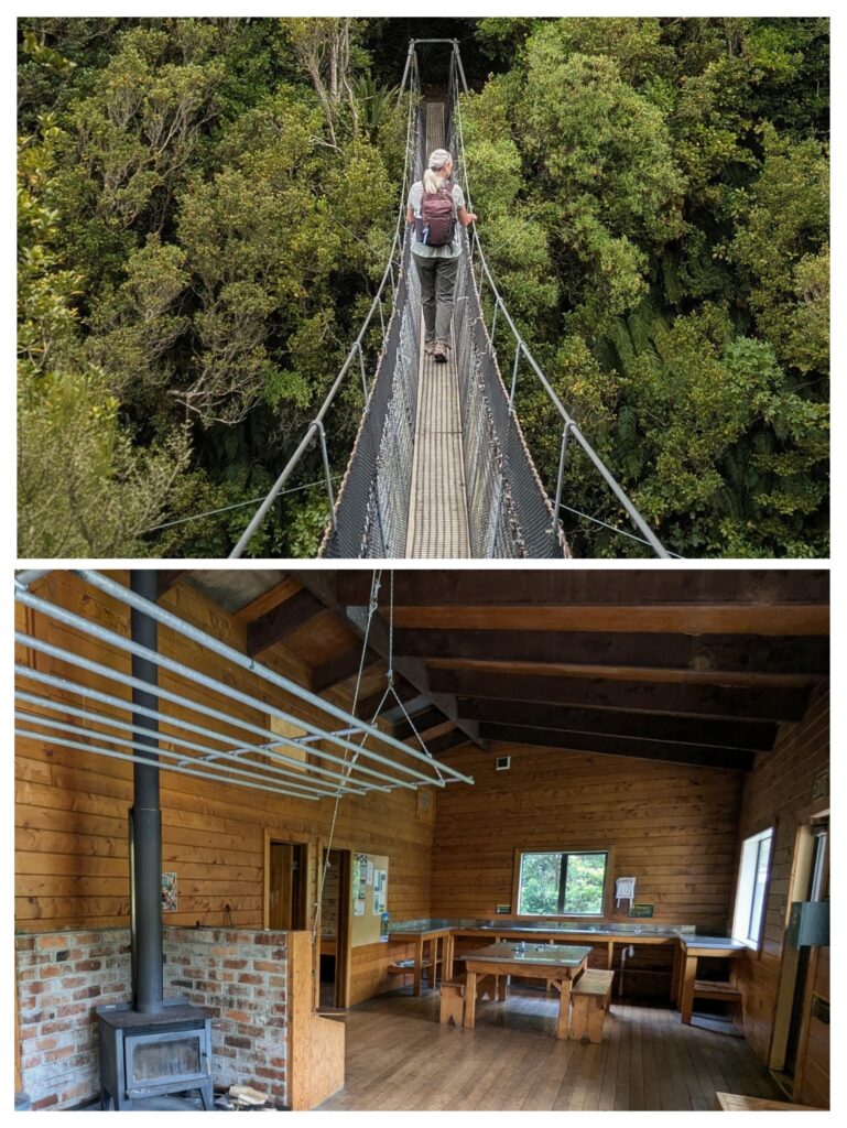 We crossed a swinging bridge over the Waingongoro river and took a detour to the Waingongoro hut, a refuge for trekkers complete with woodstove and a drying rack suspended above it, table, benches, sink with running water from tanks of collected rain water, and 2 separate bunkrooms with ample bunks. ‘Long-drop toilet’ out back!