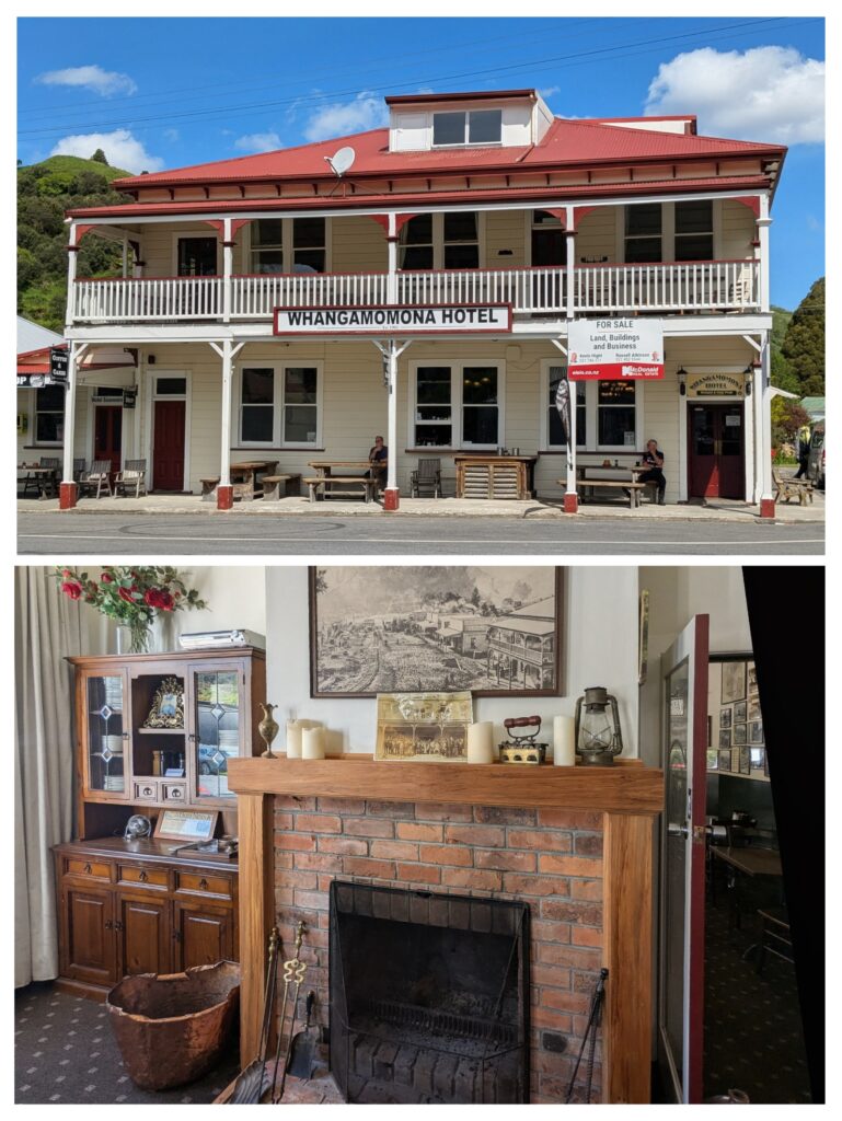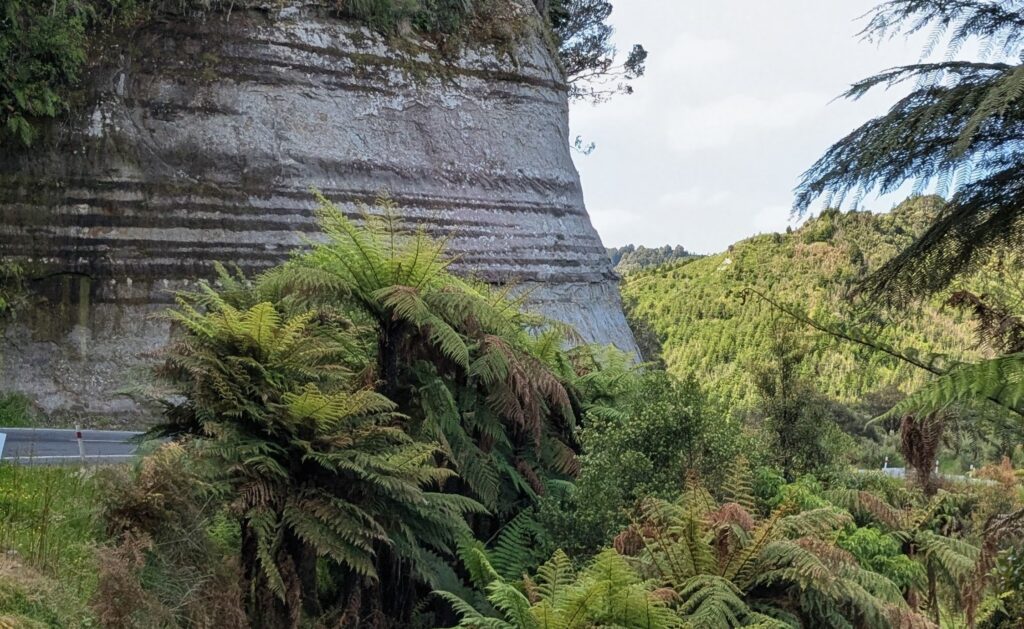 The Forgotten World Highway was originally pack trails in the late 1800’s to early 1900’s. The Railroad construction from 1900 to 1936 brought more settlers, but the Depression of the 1930’s wiped many farmers out and they abandoned their homesteads. After traversing the eastern volcanic plain the Highway becomes extremely winding, going over 3 major saddles of mountains made up of ‘Papa rock’, a soft, blue-grey mudstone or muddy sandstone that was and still is a road planners worst nightmare! It is layered as in this bluff, when wet it is slippery and sometimes the layers of mudstone catch water between them and sheets or slabs slide off from time to time. When dry it can flake off in big slabs as well. We finally made it to our destination and enjoyed sandwiches and coffee at the Whangamomona Hotel.