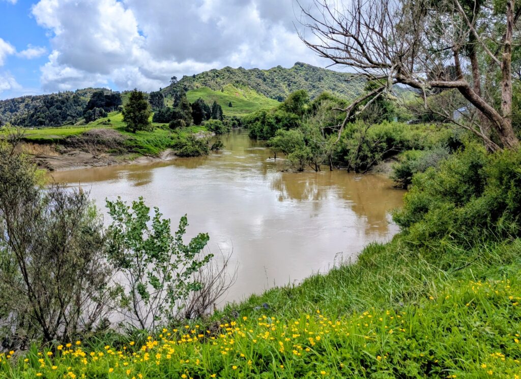 We walked over a hill and down the gravel road to see the muddy Mokau River flowing by on its path to the Tasman Sea.