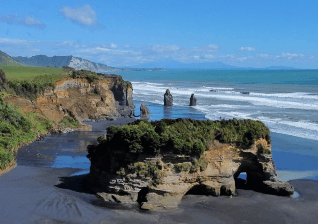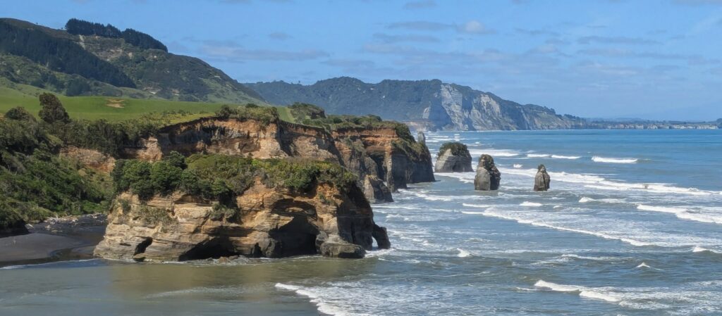 We’re moving on from the rural farmhouse but doing some sightseeing on the way. We stopped at a viewpoint to see the Three Sisters and Elephant Rock across the outlet of the Tongaporutu River.