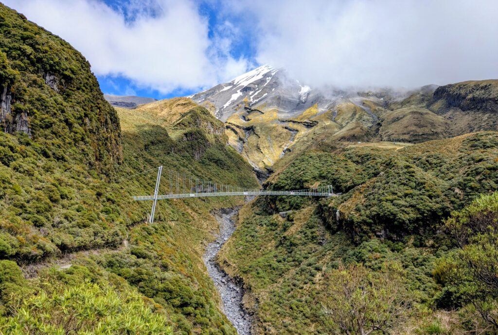 An impressive swing bridge built to make the passage over the Manganui Gorge more safe. Especially since the trail leads to the only ski area on the mountain!