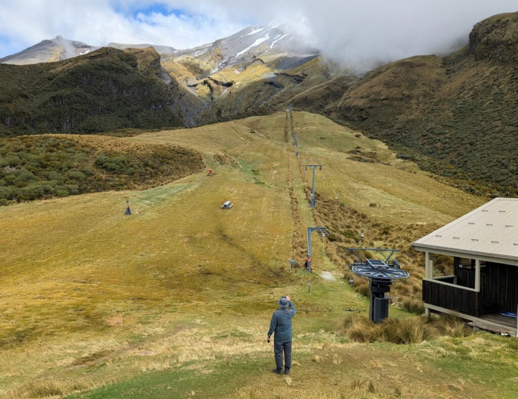 The Manganui Ski slope, 3 tow lifts after a 30 minute hike from the parking area. At least there is a ‘flying fox’, a basket strung across the gorge on cables, to transport your gear to the small ski lodge / mountain hut.