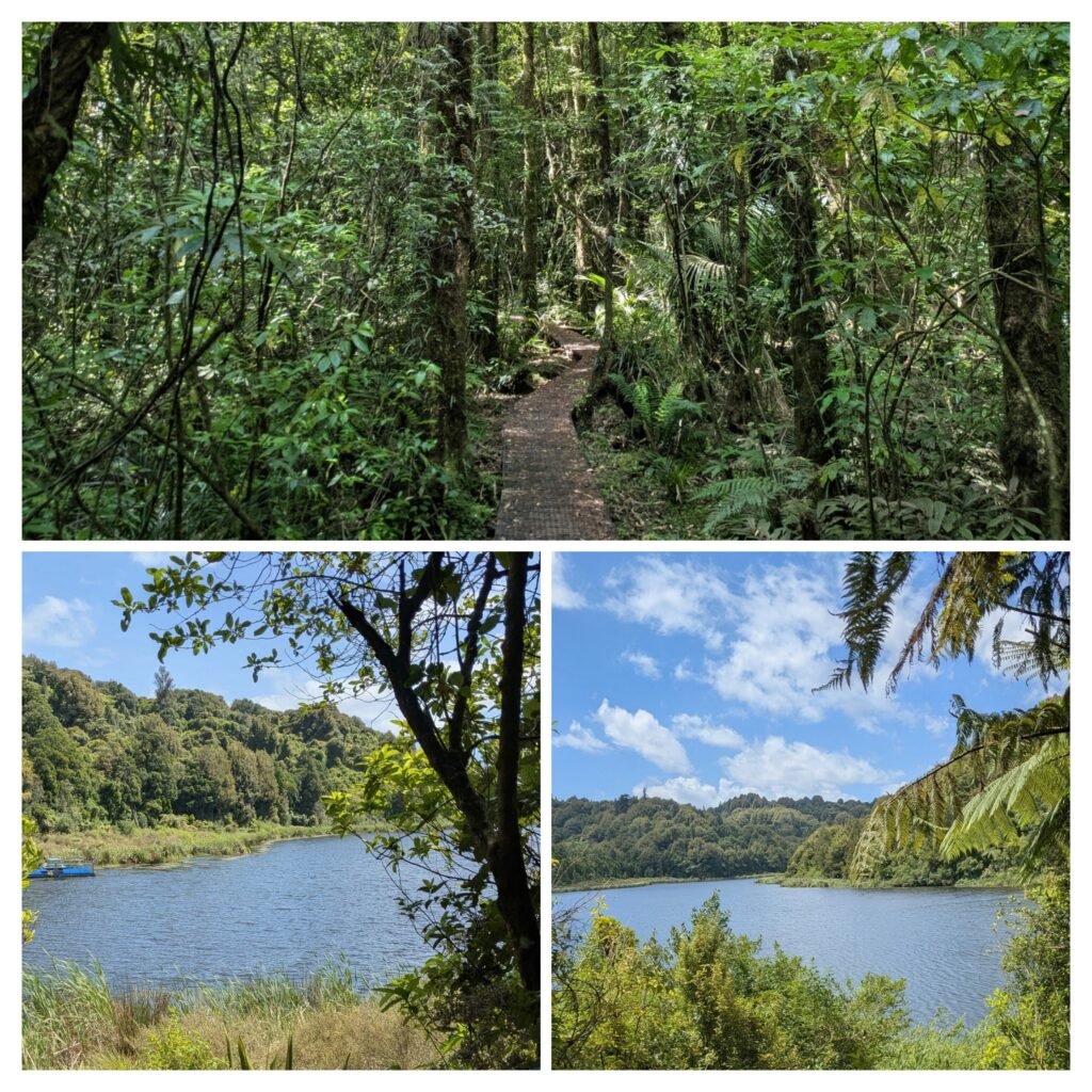 From our new home base in the tiny village of Ohawe on the south shore of the Taranaki (or Egmont) Cape, we ventured to the Rotokare Scenic Reserve for a hike in native forest and wetland around spring-fed Lake Rotokare. The Reserve has been protected from development since the 1870’s, however, lackadaisical enforcement led to more community involvement in management and ultimately to containment. A predator-proof fence was erected in 2008, completely encircling the Reserve and intensive trapping was conducted, making the Reserve completely mammal free; no rats, mice, weasels, ferrets, stoats, possums, feral dogs or cats, and no pets allowed at all! There is even a double gated entrance to get in and out to ensure that no predators enter!