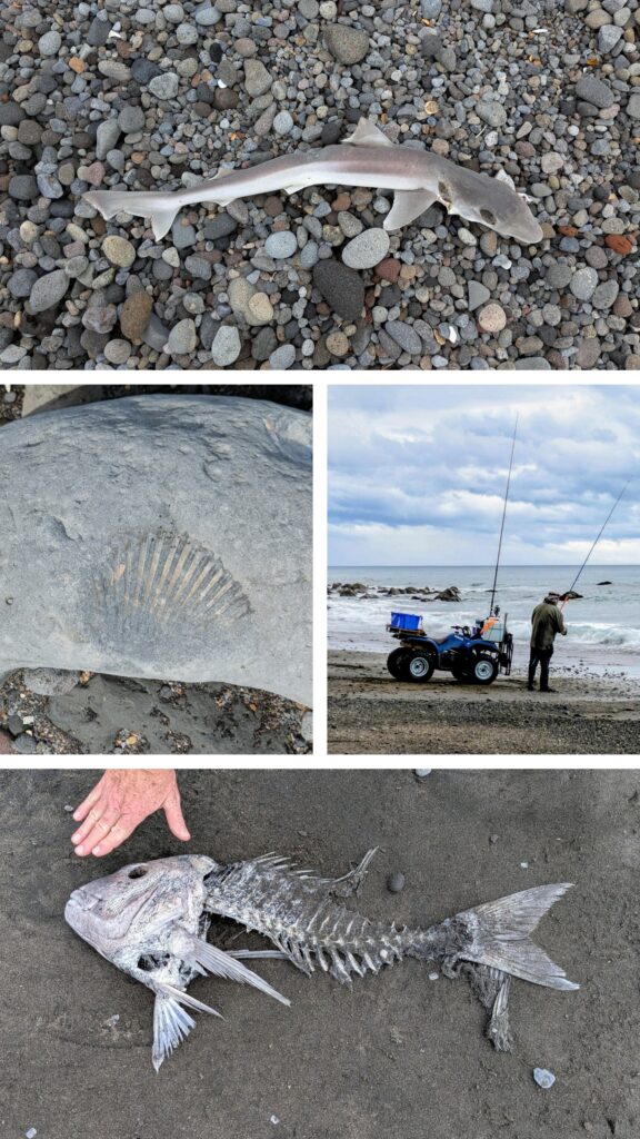 Some of the interesting things we encountered on our attempts. A fisherman, an older catch that someone apparently filleted, a fossil shell and a mummified baby shark?