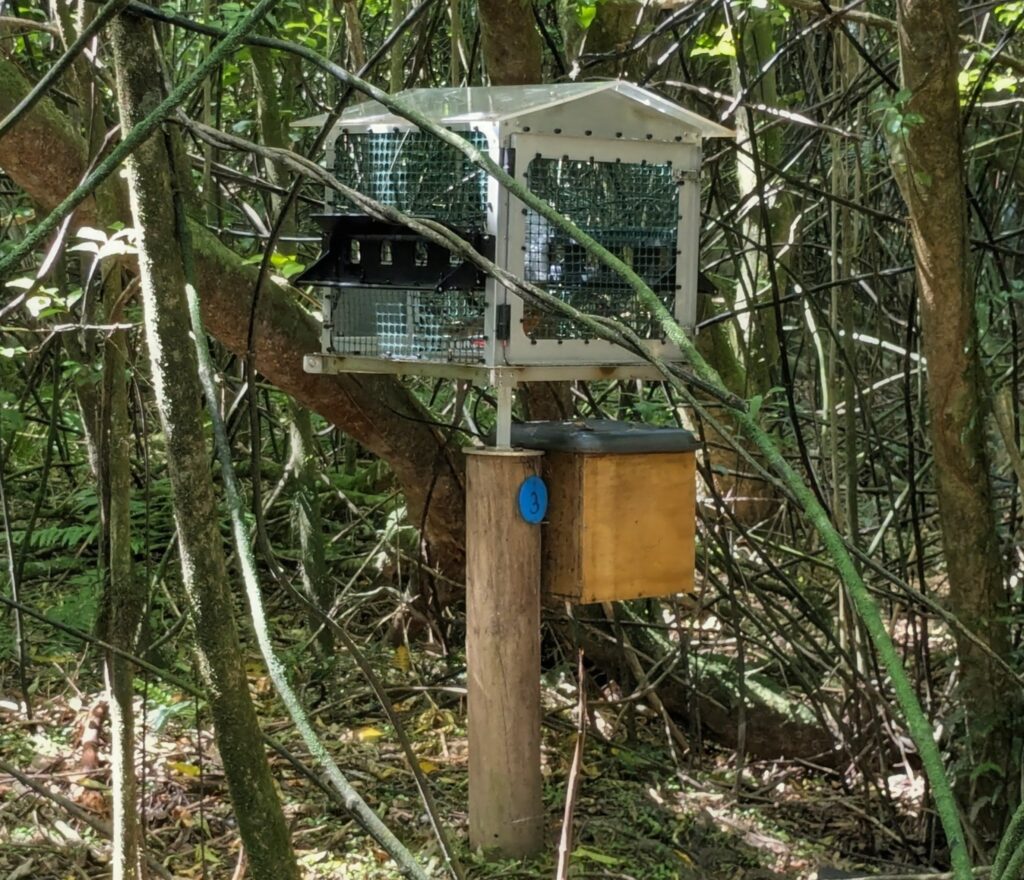 This feeder station is where we saw another endangered bird, the stitchbird or Hihi. It is a smaller wren sized bird and much too fast to film or get a picture of. It is even more endangered than the saddleback, and only exists in fenced reserves with specialized feeding stations like this to provide the nectar they feed on.
