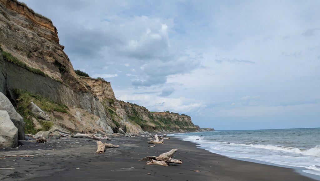 The black sand beach stretches away in the distance, we have to reach the last bluff before turning around to come back!