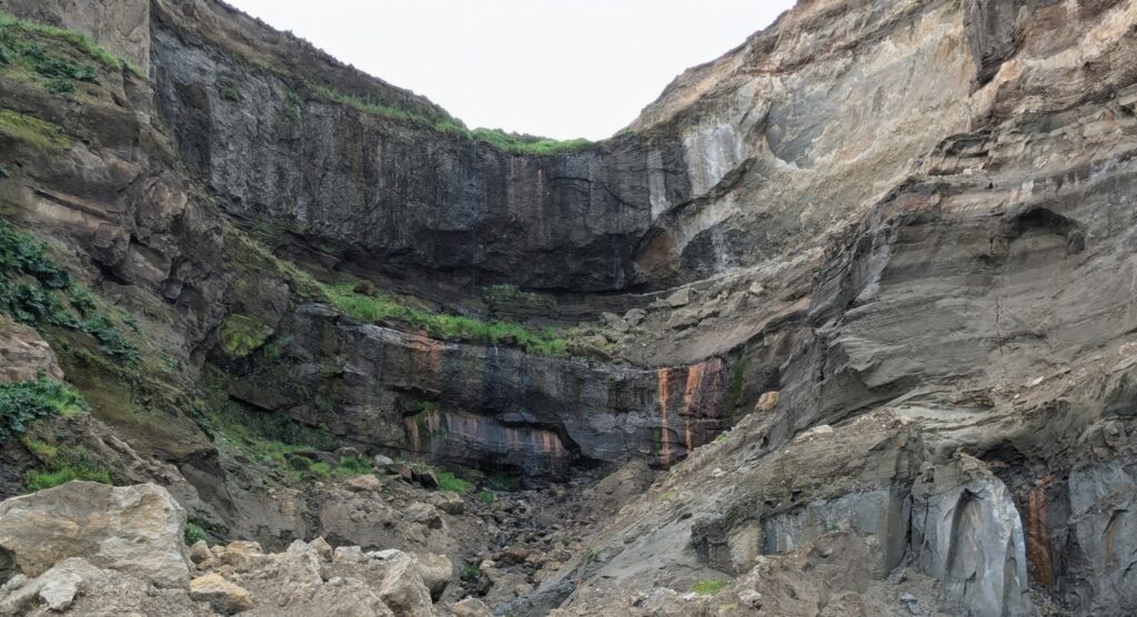 The cliffs are layered with sediment from the sea and volcanic ash from the past eruptions of Mt. Taranaki, cut and eroded by streams and copious rainfall.