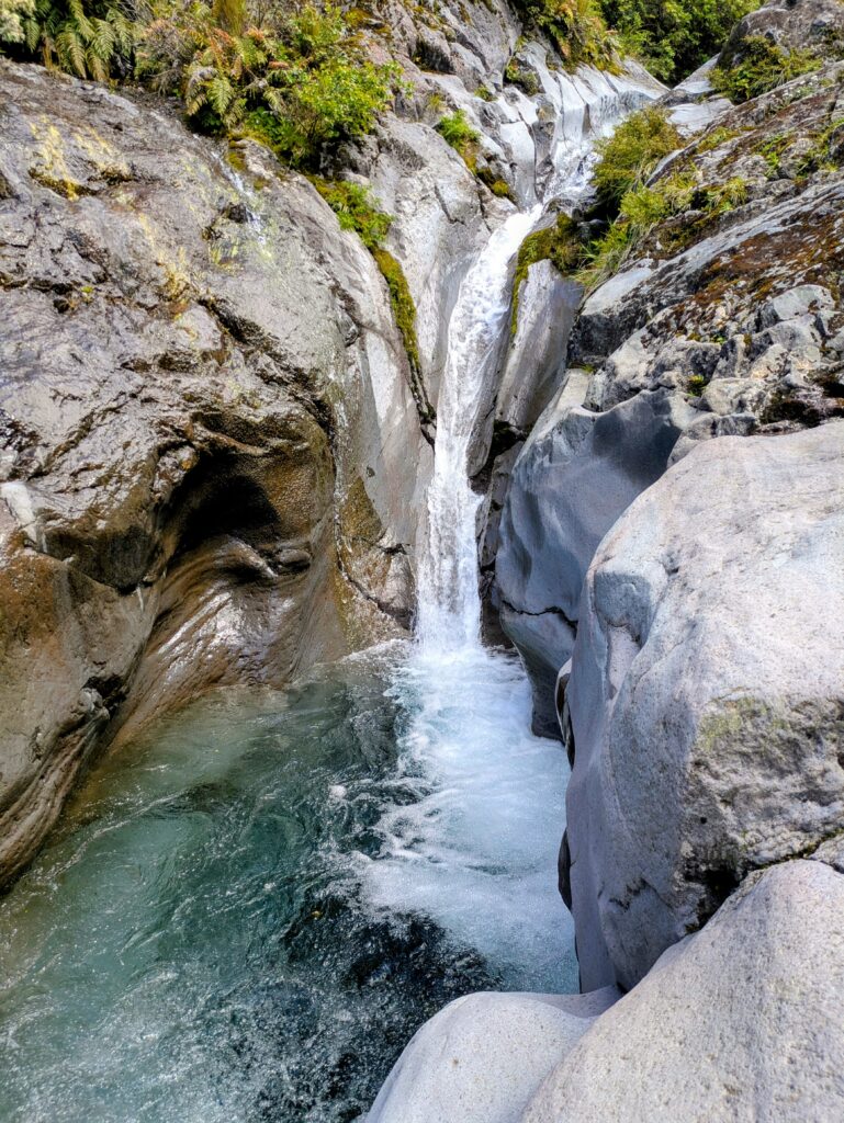 Layers can be seen in the large boulders that fall from the cliffs. In this chunk it looks like a charcoal layer, from burning forest during a volcanic eruption, or purposeful burning of the forest by the Maori or Europeans?