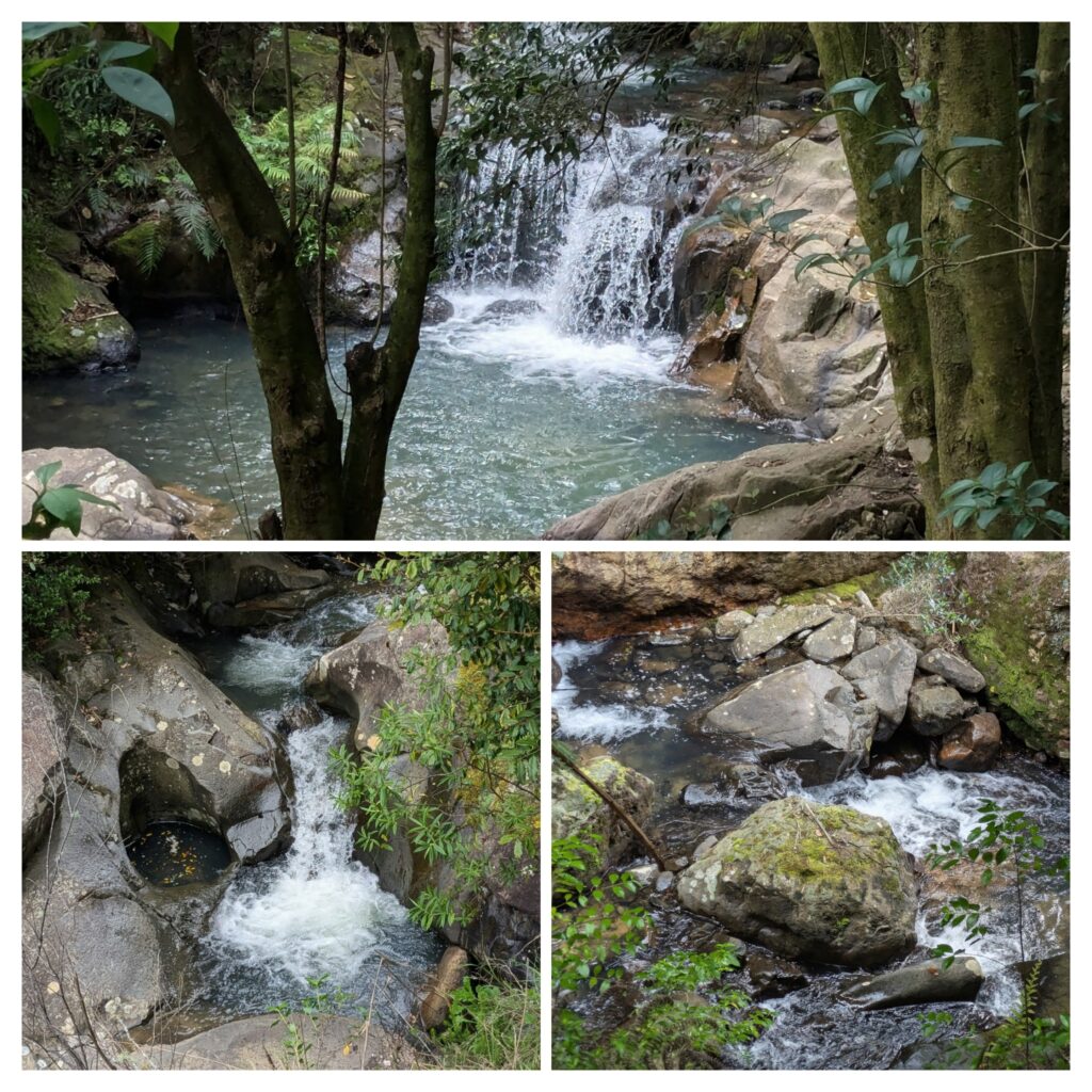 The stream. Occasional waterfalls, some obscured by the dense vegetation. The gurgle and splash as the water wears down the hard rock.