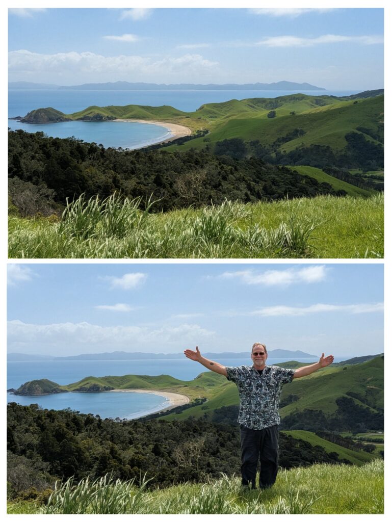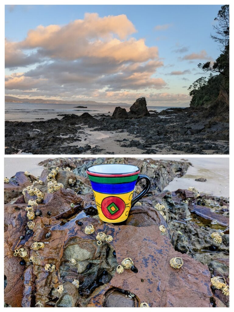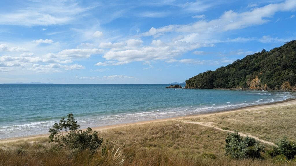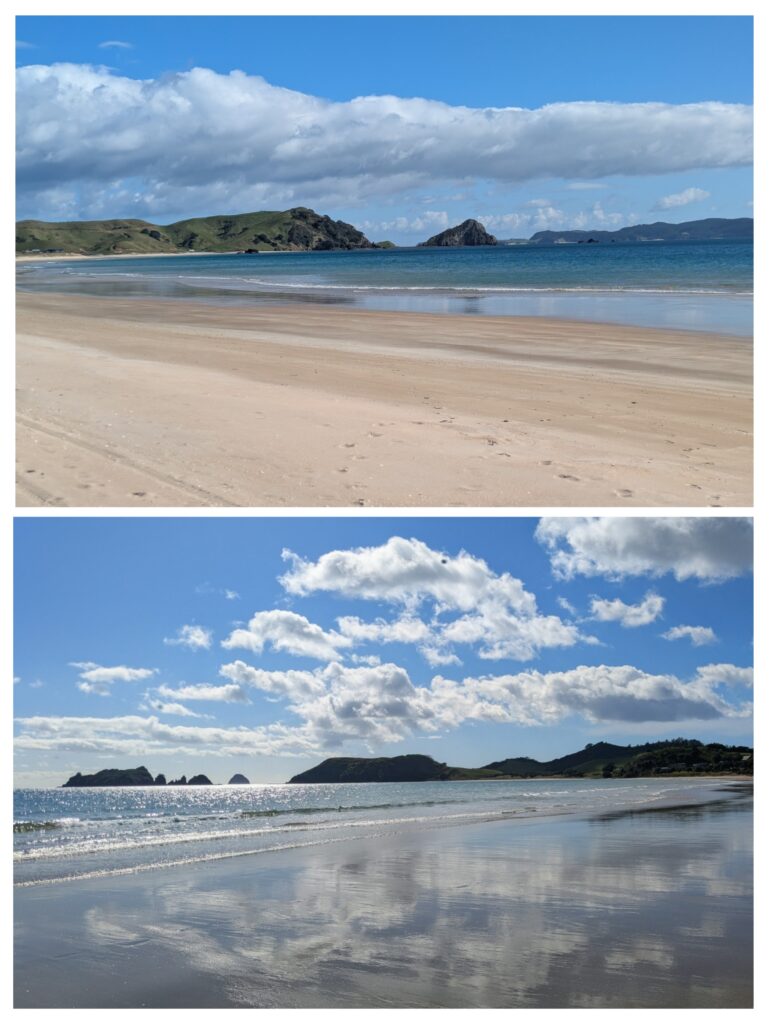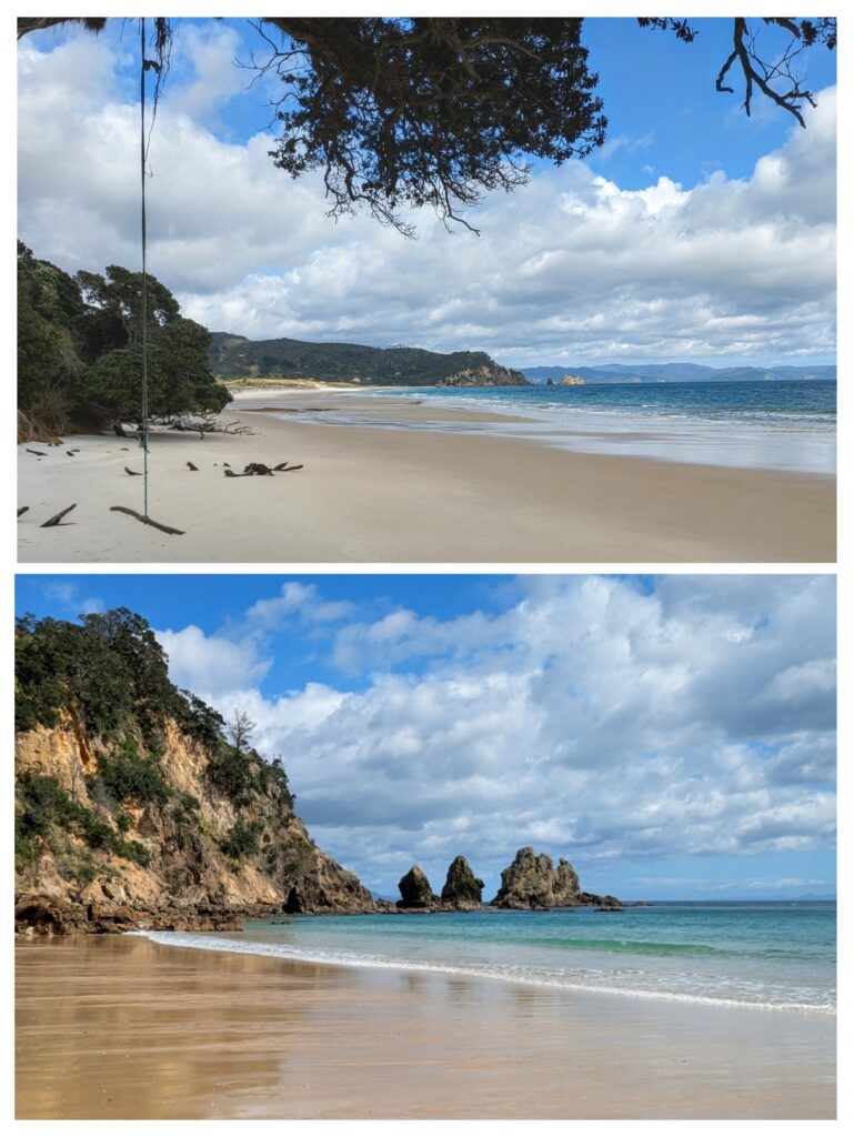 We moved today to another B&B on the east side of the peninsula, in the tiny village of Kūaotunu (pronounced “koo-ow-t00-noo”). A real beachy town, with a sweeping walkable sand beach and short drives or long walks to neighboring beaches.