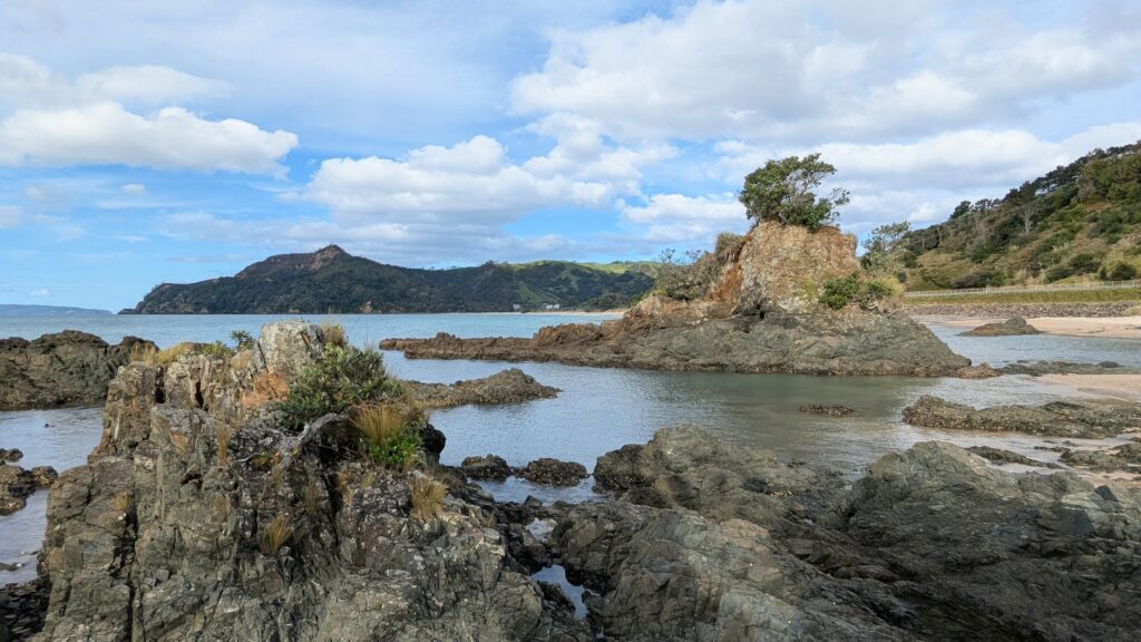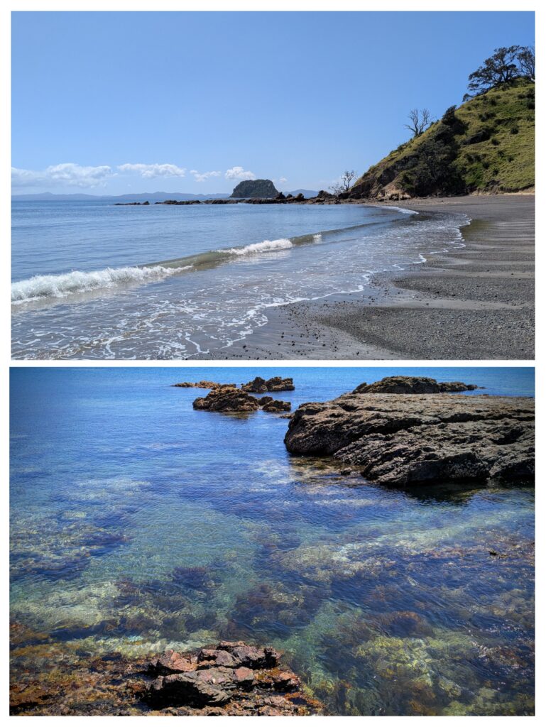 Fletcher Bay at the end of the road (or the beginning of the Coromandel Coastal Walkway). The sea water is crystal clear out around the rocks at the end of the bay.