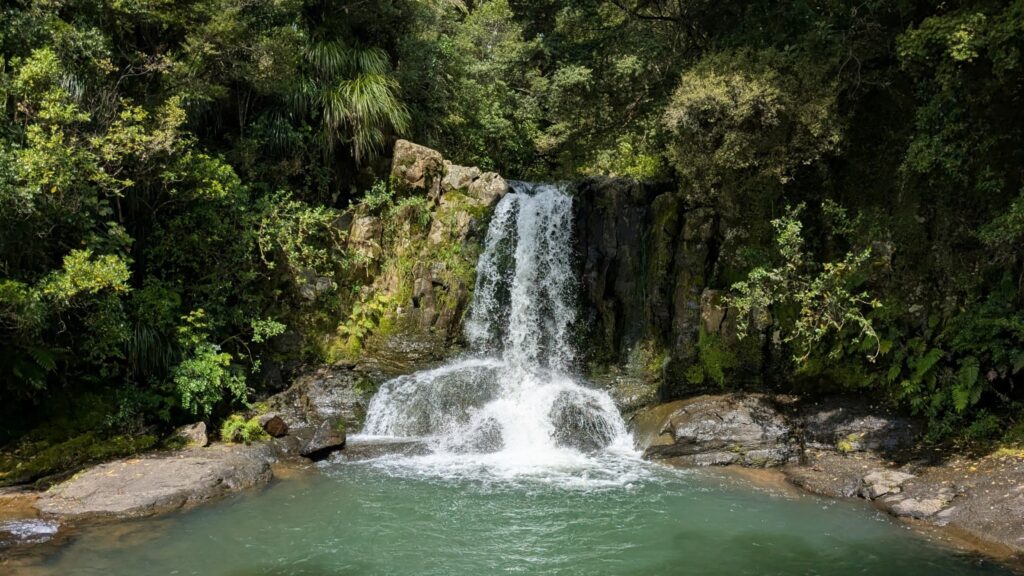 Halfway back over the ridge you drop down to Otama Beach, with a rope and stick swing at one end, and a rocky headland at the other end.