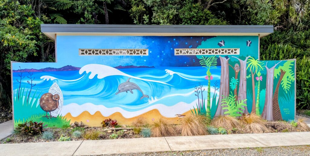 The colorfully painted bathroom at the east end of Kuaotunu beach.