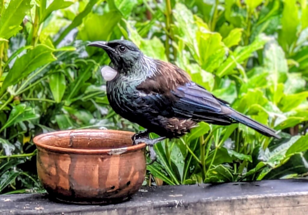 Our host provides liquid food for the many birds that visit the lush garden planted on the slope down to the road and the banks of the harbor. The tui came in frequently for drinks and we finally got a great picture!