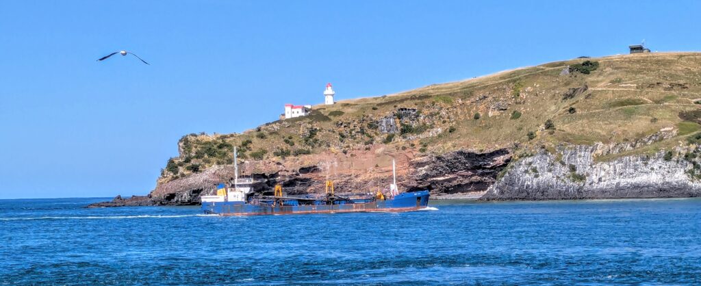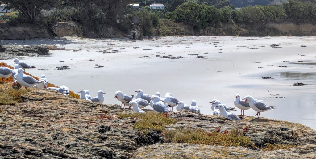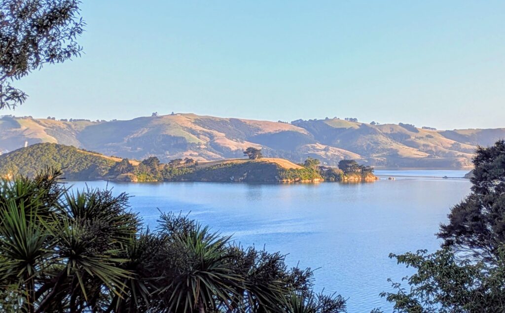Looking across the harbor mouth at the lighthouse on Taiaroa head, we watched a ship come in, dwarfing the lighthouse! We saw tiny dots of white on the hillside which are nesting northern royal albatross. We didn’t bring our binoculars, but you can watch live-cam videos HERE! Our host worked for several years at the Royal Albatross Centre at Taiaroa Head and we enjoyed sharing our biology and bird care backgrounds!