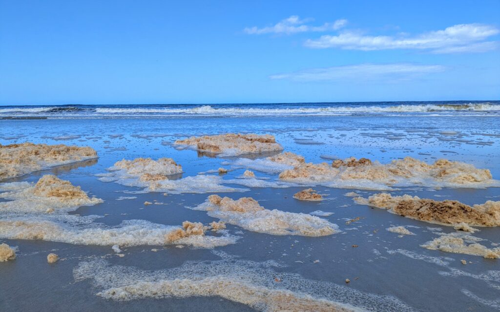 We were able to get on the beach near the mouth of the Taieri River, near the town of “Taieri Mouth”. We were mesmerized by the sea foam blowing across the sand, driven by the stiff breezes and hydroplaning on a thin film of sea water! Watch video HERE!